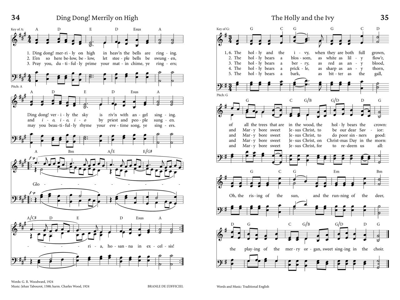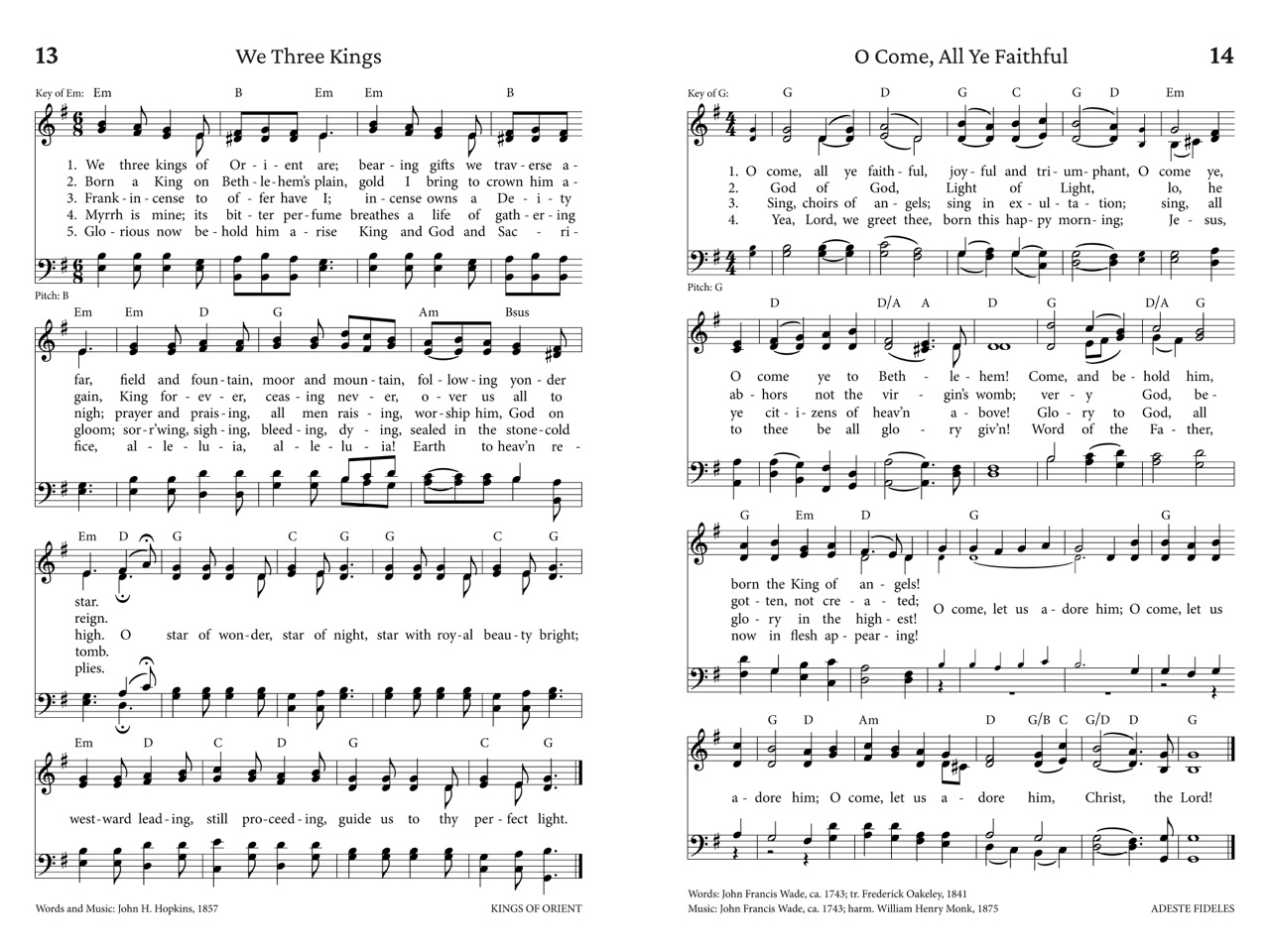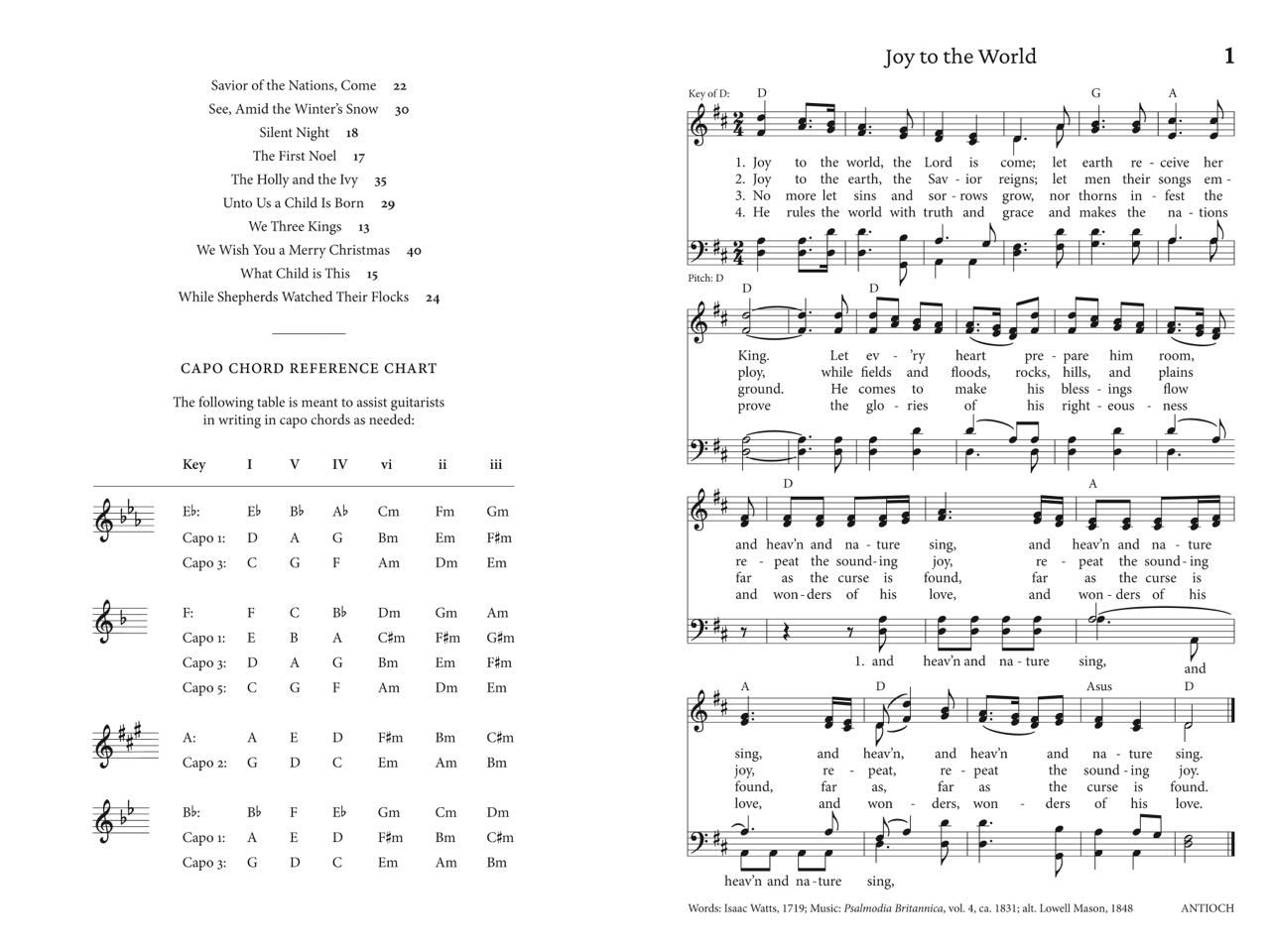 Presenting 40 selections: traditional carols from Advent, Christmas, and Epiphany, and several well-known secular songs. The book is elegantly typeset for maximum legibility, with simplified chord symbols above the staff. The starting pitch of the melody is also shown for leaders to use a pitch pipe.
